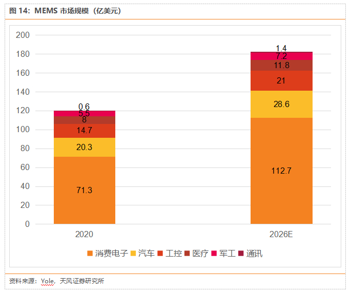 多种应用趋势推动MEMS市场规模持续增长。MEMS下游应用主要包括消费电子、工控、通讯、汽车、医疗等领域。其中,消费电子是MEMS产品的核心市场,市场份额约占60%。MEMS市场具有多种应用趋势,包括老产品新应用(如传统的压力传感器、MEMS麦克风等产品总量随着新兴终端产品应用不断增加)、新领域新挑战(如5G、自动驾驶等加大了MEMS器件需求量)、老行业新需求(如手机中的5G射频元件BAW、汽车中的红外线传感器等需求快速增长),这些趋势都促进了MEMS市场的增长。根据Yole数据,2020年全球MEMS市场规模为121亿美元,2026年预计增长至182亿美元,年复合增长率约为7.2%。