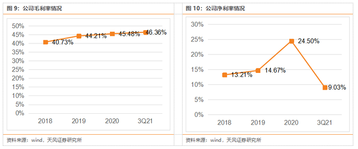 毛利率维持高位,净利率同比有所增长。近年来,公司毛利率持续保持稳定增长态势。2018~2020,公司毛利率分别为40.73%、44.21%以及45.48%;净利率分别为13.21%、14.67%以及24.50%。3Q21,公司由于业务发展需要,研发投入与财务费用均有所增长,影响了公司盈利水平,导致公司3Q21毛利率达到46.36%,但净利率为9.03%。