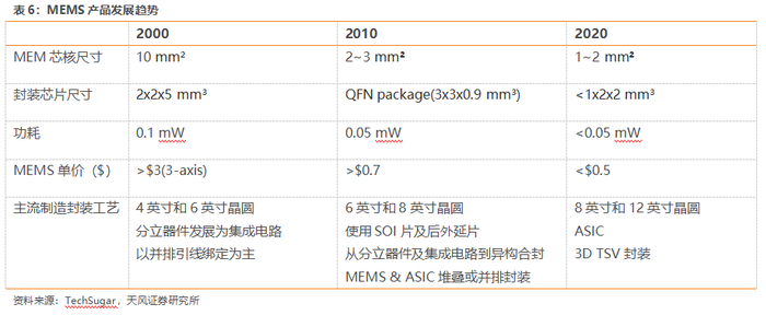 MEMS器件工艺技术不断升级迭代,正向小尺寸、高性能发展。为满足如智能手机、平板电脑及可穿戴设备等消费电子的应用需求,MEMS正向小尺寸发展。同时,航天航空类的高端应用也推动MEMS器件向高性能发展。2000~2020,MEMS芯核尺寸已由10 mm²缩小至1~2 mm²;功耗由0.1mW降至0.05mW以下;平均单价也从3美金以上降至0.5美金左右。