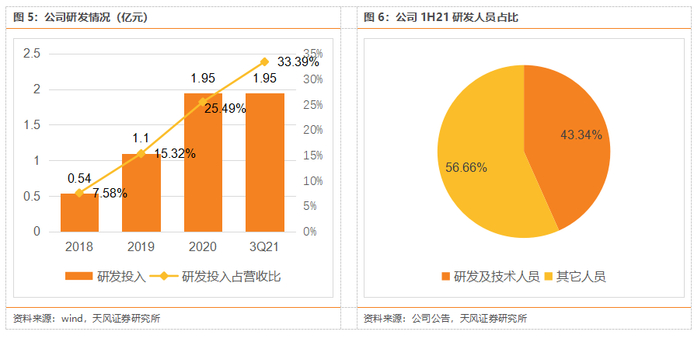 坚持自主创新,持续围绕主营业务进行深入系统研究。公司坚持自主创新战略,研发团队围绕MEMS、GaN业务的关键技术进行了深入系统研究,自主研发并掌握了相关工艺核心技术及相关产品的软硬件设计核心技术。近年来,公司一直保持着较高的研发投入水平和强度,2018~2020的研发费用分别为0.54、1.10、1.95亿元,占当年营收比例分别为7.58%、15.32%、25.49%。3Q21,公司继续大力推进MEMS工艺开发技术,MEMS晶圆制造技术、GaN外延材料生长工艺技术、GaN芯片及应用设计技术等的研发,研发费用达到1.95亿元,占营收的比重达到33.39%。同时,公司具有专业的技术团队,截至1H21,公司拥有博士37名,硕士162名,合计占公司总人数的31.94%;且公司研发及技术人员合计270人,占公司总人数的43.34%。