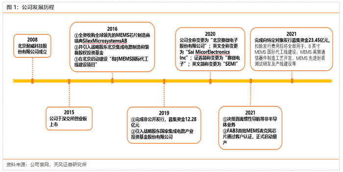 战略转型聚焦半导体业务,内生外延持续拓展。公司自成立以来,以传感终端应用为起点,通过内生发展及外延并购成功将业务向产业链上游延伸拓展,目前MEMS芯片的工艺开发及晶圆制造已成为公司的主要核心业务。公司于2021年12月发布关于瑞典子公司收购德国产线资产的公告,将公司核心主业传感器和芯片工艺制造的业务范围进一步拓宽至汽车电子领域、迅速提升可兼容 MEMS 与 CMOS 芯片集成工艺制造的境外产能,提高公司在全球范围内的综合竞争实力。