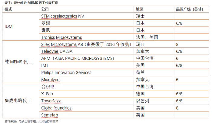 全球MEMS制造商业模式主要分为IDM、纯MEMS代工、集成电路代工三类。全球MEMS代工主要可IDM、纯MEMS代工、集成电路代工。其中,纯MEMS代工不提供任何设计服务,企业根据客户提供给的MEMS芯片设计方案,进行工艺制程开发以及代工生产服务,代表企业包括TeledyneDalsa、IMT等。IDM模式为自己设计自行生产,在满足自身晶圆制造需求后,也会将剩余产能外包出去,提供MEMS代工服务。传统集成电路MEMS代工则为传统集成电路(主要为CMOS)代工企业以原有的CMOS产线为基础,嵌套部分特殊的生产MEMS工艺技术,将旧产线转化为MEMS代工线,代表企业包括台积电、Global Foundries等。
