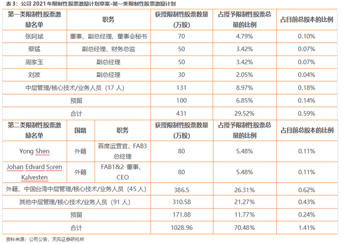 2021年限制性股票激励计划,吸引并留住海内外人才。公司为进一步建立、健全公司长效激励机制,吸引和留住优秀人才,充分调动公司(含子公司)董事、高级管理人员、中层管理人员及/或核心技术/业务人员的积极性,有效地将股东利益、公司利益和核心团队个人利益结合在一起,使各方共通关注公司的长远发展,公司于2021年11月推出《2021年限制性股票激励计划》。该激励计划拟向激励对象授予权益总计不超过1459.96万股,约占该激励计划草案公告时公司股本总额的2%,首次授予的激励对象共计159人,包括董事、高级管理人员、中层管理人员以及核心技术/业务人员。