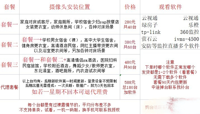 澎湃新闻记者以买家身份向该卖家咨询,对方称,因微信账号会被封,现在他只能通过推特和电报群聊引流。他称,花280元到480元可购买对应的“套餐”,通过对应的设备ID,用户便能实时监控他人卧室、厕所、按摩店、女更衣室、学校女宿舍、妇科检查科室、情趣酒店、民宿等场所,观看软件包括云视通、绿房子、乐橙、萤石云、360监控。