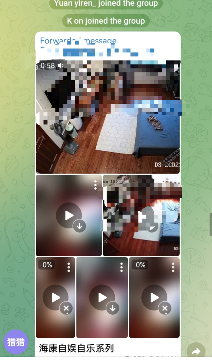 澎湃新闻近日调查发现,有不少国内监控视频在境内外网络平台传播,以推特(Twitter)、电报(Telegram)和QQ等平台为主。这背后形成了一条利益链:有人私自安装偷拍摄像头或破解他人摄像头权限,然后将摄像头ID出售,供人实时观看,还有人专门做卖家的下线代理。