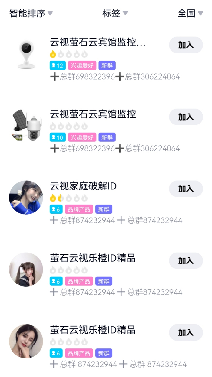澎湃新闻查询发现,QQ上有多个名为“云视萤石云宾馆监控”“云视家庭破解ID”的群聊,已无法加入,但根据群聊介绍可关联到相关的客服人员或者QQ号,对方均表示可以售卖摄像头ID或者录播视频,且称可出售针孔设备。