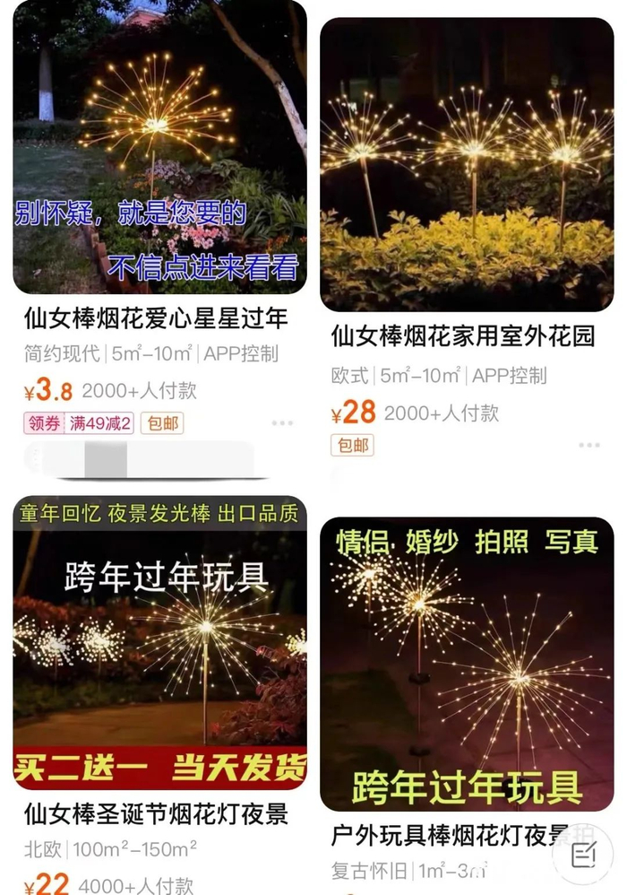 记者在某大型购物网站上搜索关键词“仙女棒”,发现商品极其有限,封面图基本都是一种蒲公英状的装饰灯,商品名还会加上“小夜灯”“拍照玩具”“发光棒”等描述;由于部分小型仙女棒会用于充当生日蛋糕的蜡烛,所以“生日蜡烛”也成了其打掩护的“黑话”。虽是挂羊头卖狗肉,但都不忘在封面图上加一句“就是你想要的”。