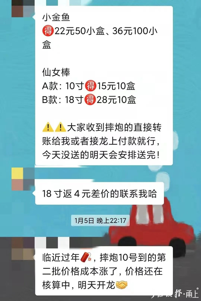此外,如同林女士说的那样,今年,小区群里团购冷光烟花的生意尤为火爆。记者身边不少低龄孩子的家长,都在团购群里下了单。家住海曙区的陈女士说,十多天前有人在小区群里发了团购接龙,仙女棒和“小金鱼”都有,接龙的业主有100多人。烟花迅速售罄后,卖家还直言后补的第二批货要涨价。
