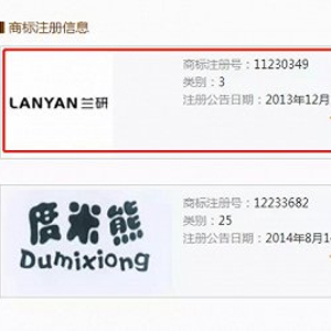 信息显示,第3类商标“LANYAN兰研”专用权起止日期为2013年12月14日至2023年12月13日,所包含商品项目包括洗涤剂、化妆品、牙膏、香精油等。