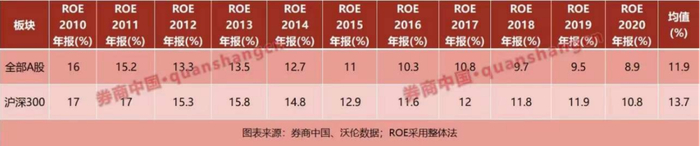 A股具有相似的统计结果:从2010年至2020年过去十年间,A股整体法下的平均ROE是11.9%,沪深300的平均ROE为13.7%。目前中国十年期国债收益率为2.8%。