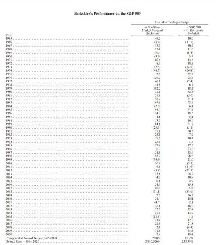附图:伯克希尔哈撒韦1965年至2020年的投资收益