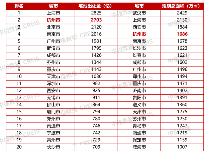 表:2021年全国宅地成交TOP20城市排行榜(市本级)