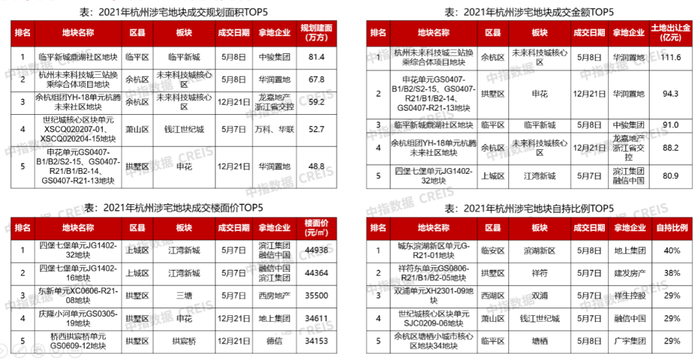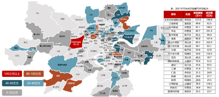 图:2021年杭州市区拿地权益面积、权益金额TOP20企业