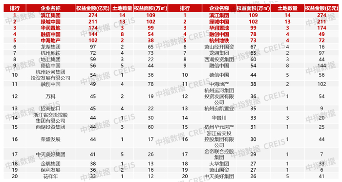 1、杭州本土龙头房企和城投背景平台,拿地权益金额占比TOP20房企总量的51.4%,权益面积占比66.6%。包括滨江、绿城、德信、中天、深耕临安的地上集团等等,杭州地铁、浙江省交投、西湖投资集团等城投平台表现也非常亮眼;