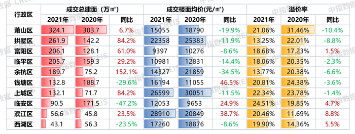 成交规模:2021年杭十区中有7个区成交总建面超过100万方,萧山区成交规模保持第一,拆分后的余杭和临平区成交规模仍排4、5名,行政区调整后拱墅区和上城区成交规模大幅增加;下半年市场低迷,临安、钱塘、富阳等偏远郊区成交规模大幅下降,拉低全年成交规模。