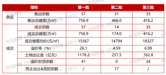 第三批集中供地:土拍市场回暖,房企竞争较激烈,推出的35宗地块全部成交,其中24宗封顶摇号,封顶率69%。