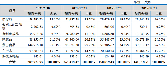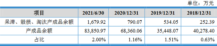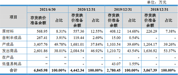 2018年末、2019年末、2020年末和2021年6月末,沃得农机对呆滞、毁损、淘汰的产成品已全额计提存货跌价准备,金额分别为252.39万元、534.05万元、790.07万元和1679.92万元,占比分别为0.63%、1.51%、1.16%和2.00%。