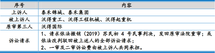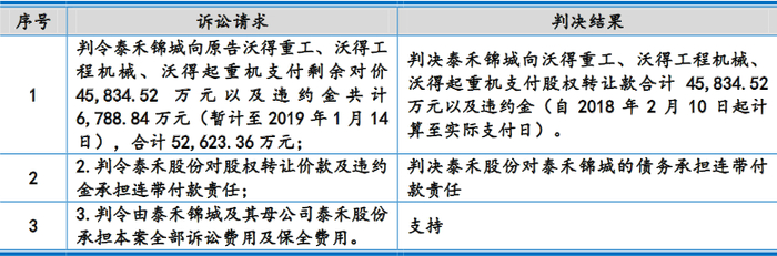 2019年1月31日,江苏省高级人民法院受理原告沃得重工、沃得工程机械、沃得起重机(以下简称“沃得重工等3家公司”)诉泰禾锦城、泰禾股份股权转让纠纷一案,沃得国际为第三人,诉讼理由:根据协议中关于沃得重工分期付款的约定,截至2019年1月14日,沃得重工尚有4.58亿元二期股权转让款泰禾锦城未付。诉讼请求为:判令泰禾锦城向原告沃得重工、沃得工程机械、沃得起重机支付剩余对价4.58亿元以及违约金共计6788.84万元(暂计至2019年1月14日),合计5.26亿元;判令泰禾股份对股权转让价款及违约金承担连带付款责任;判令由泰禾锦城及其母公司泰禾股份承担本案全部诉讼费用及保全费用。