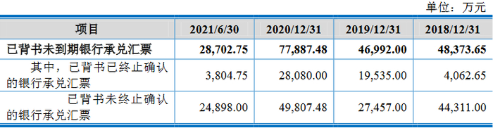 2017年末、2018年末、2019年末、2020年末和2021年6月末,沃得农机已背书未到期银行承兑汇票分别为9.32亿元、4.84亿元、4.70亿元、7.79亿元和2.87亿元,其中,已背书已终止确认的银行承兑汇票分别为4.30亿元、4062.65万元、1.95亿元、2.81亿元和3804.75万元,已背书未终止确认的银行承兑汇票分别为5.02亿元、4.43亿元、2.75亿元、4.98亿元和2.49亿元。