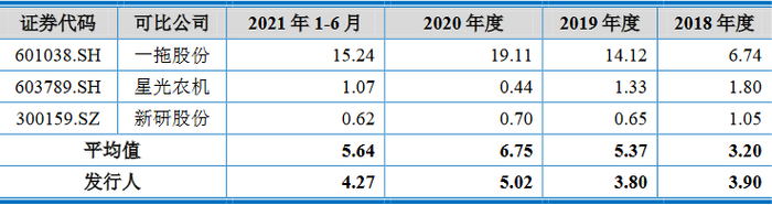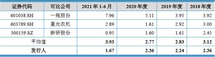 2017年、2018年、2019年、2020年和2021年1-6月,沃得农机应收账款周转率分别为4.72次、3.90次、3.80次、5.02次和4.27次,同行业可比上市公司应收账款周转率平均值分别为4.29次、3.20次、5.37次、6.75次和5.64次。2017年、2018年和2019年高于星光农机和新研股份,各期均低于一拖股份。
