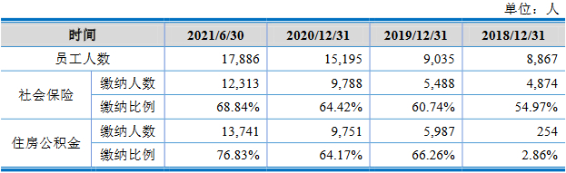 2018年末、2019年末、2020年末和2021年6月末,沃得农机员工总人数分别为8867人、9035人、15195人和17886人,合计未缴纳社会保险人员分别为3993人、3547人、5407人和5573人,占比分别为45.03%、39.26%、35.58%和31.16%;合计未缴纳住房公积金人员分别为8613人、3048人、5444人和4145人,占比分别为97.14%、33.74%、35.83%和23.17%。