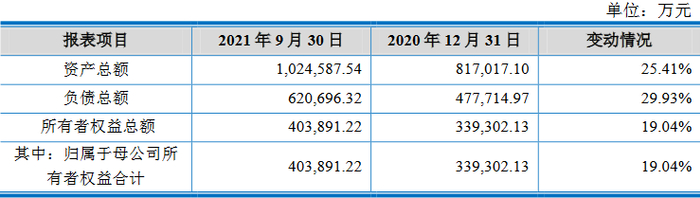 截至2021年9月30日,沃得农机资产总额为102.46亿元,较2020年末增加25.41%,主要原因系随着生产和销售规模的扩大,公司应收账款、存货、固定资产金额有所增加所致;负债总额为62.07亿元,较2020年末增加29.93%,主要系随着生产和采购规模的扩大,短期借款和应付账款余额有所增加致;归属于母公司所有者权益合计40.39亿元,较2020年末增加19.04%,主要系未分配利润增加所致。