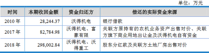沃得农机关联方偿还拆借资金及利息主要发生在2010年、2017年和2018 年。沃得农机关联方经多次逐步向公司清偿拆借的资金及利息,直至2018年末公司资金拆借清理完毕。