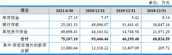 2021年6月末货币资金7.51亿元