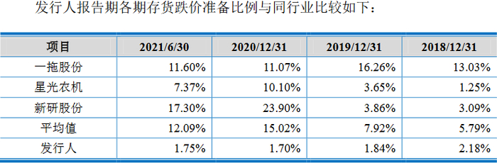 2018年末、2019年末、2020年末和2021年6月末,沃得农机存货跌价准备比例分别为2.18%、1.84%、1.70%和1.75%,低于同行业各家可比上市公司存货跌价准备比例。同期,同行业可比上市公司存货跌价准备比例平均值分别为5.79%、7.92%、15.02%和12.09%,一拖股份跌价率分别为13.03%、16.26%、11.07%和11.60%,星光农机跌价率分别为1.25%、3.65%、10.10%和7.37%,新研股份报告期各期末跌价率分别为3.09%、3.86%、23.90%和17.30%。