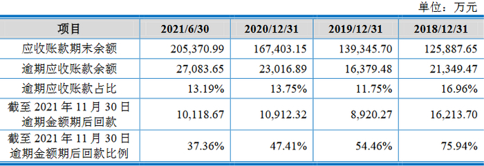 2018年、2019年、2020年和2021年上半年,沃得农机逾期应收账款余额分别为2.13亿元、1.64亿元、2.30亿元和2.71亿元,逾期应收账款占比分别为16.96%、11.75%、13.75%和13.19%。截至2021年11月30日,该公司逾期金额期后回款分别为1.62亿元、8920.27万元、1.09亿元和1.01亿,逾期金额期后回款比例分别为75.94%、54.46%、47.41%和37.36%。