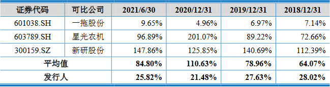 2017年、2018年、2019年、2020年和2021年1-6月,沃得农机研发费用分别为1.36亿元、1.49亿元、1.92亿元、2.99亿元和1.25亿元,占营业收入的比例分别为3.14%、3.61%、4.15%、4.29%和3.49%;同行业可比上市公司研发费用率平均值分别为5.01%、5.40%、6.72%、9.56%和4.87%。