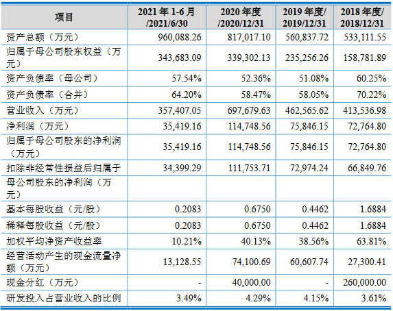 2017年、2018年、2019年、2020年和2021年1-6月,沃得农机实现营业收入分别为43.21亿元、41.35亿元、46.26亿元、69.77亿元和35.74亿元,实现归属于母公司股东的净利润分别为8.06亿元、7.28亿元、7.58亿元、11.47亿元和3.54亿元,实现扣除非经常性损益后归属于母公司股东的净利润分别为6.71亿元、6.68亿元、7.30亿元、11.18亿元和3.44亿元。