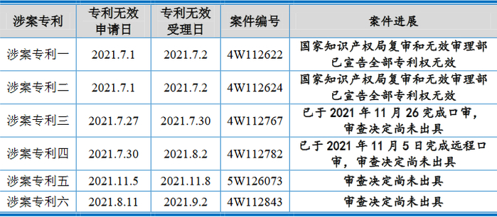 涉诉专利均已申请无效宣告程序,其中2项涉诉专利经国家知识产权局复审和无效审理部审查后宣告无效,相应诉讼标的为3.39亿元,占诉讼标总额的90.65%,其他涉诉专利尚未收到审查决定。