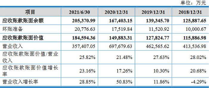 2018年、2019年、2020年和2021年1-6月,沃得农机应收账款账面价值增长率分别为20.68%、10.30%、17.26%和23.16%,营业收入增长率分别为-4.29%、11.86%、50.83%和28.85%。
