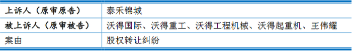 针对泰禾锦城与沃得国际、沃得重工、沃得工程机械、沃得起重机、王伟耀股权转让纠纷一案((2019)苏民初8号),一审法院江苏省高级人民法院判决驳回原告全部诉讼请求。