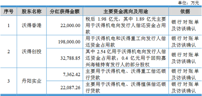 前述可知,沃得农机此前的现金分红中,24.23亿元用于沃得机电和沃得重工偿还资金占用款给公司。沃得机电和沃得重工均为实际控制人王伟耀控制的企业。