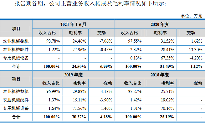 沃得农机称,2018年度至2020年度,公司农业机械整机产品销售毛利率呈现逐渐上升趋势,2021年上半年主要由于拖拉机销售比重较高,导致整机产品毛利率下降。