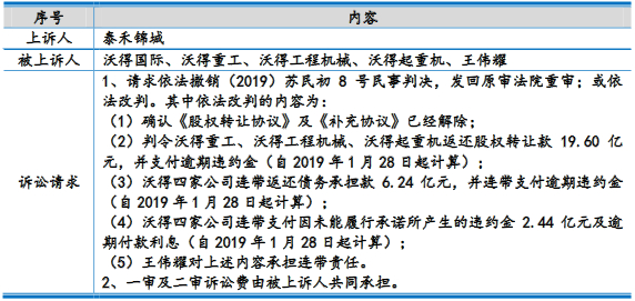 2019年1月31日,江苏省高级人民法院受理原告泰禾锦城诉被告沃得国际、沃得重工、沃得工程机械、沃得起重机、王伟耀股权转让纠纷一案,诉讼理由为:沃得四家公司存在违约行为,沃得四家公司未能完成其关于促成沃得宝华通过综合平衡的规划方案以及取得规划许可证的承诺,未能完成其关于取得林地砍伐指标、砍伐证及迁移或砍伐工作的承诺,未能按照约定提供沃得宝华开发建设的临时道路,未能按照约定铺设市政配套综合管网,致使泰禾锦城无法对沃得宝华进行建设开发。诉讼请求为:确认《股权转让协议》及《补充协议》已 经解除;判令沃得四家公司返还股权转让款及沃得宝华债务承担款25.65亿元,并赔偿违约金及损失4.32亿元(暂计至2019年1月23日),合计29.97亿元;判令王伟耀对上述款项承担连带责任。