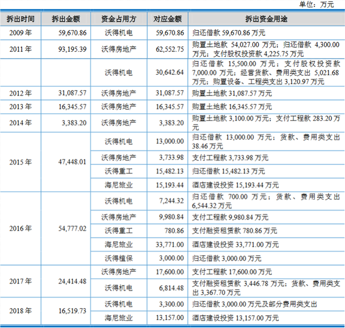 沃得农机各年度拆出资金主要用于四种支出。一是为发展房地产业务,部分资金由沃得房地产用于购置土地、支付工程款;二是部分资金用于海尼旅业石梅湾威斯汀酒店建设涉及土地款及工程款;三是沃得机电、沃得重工和沃得植保因生产运营需要资金,部分资金用于其经营中的材料采购款和费用支出;四是除使用自有资金外,实际控制人旗下酒店、房产公司、沃得机电及沃得重工等因发展需要向银行进行了贷款,部分资金用于归还银行贷款及相关利息。