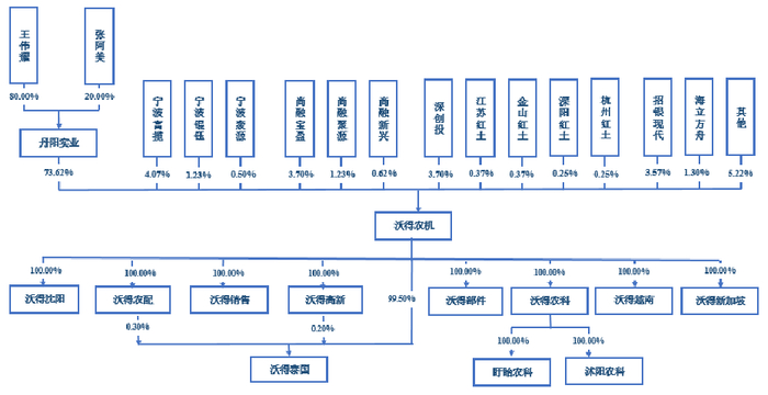 沃得农机的控股股东为丹阳市沃得实业发展有限公司(以下简称“丹阳实业”),实际控制人为王伟耀、张阿美夫妇。丹阳实业持有沃得农机12.52亿股股份,持股比例为73.62%。王伟耀、张阿美分别持有丹阳实业80.00%和20.00%的出资额,通过丹阳实业合计间接持有沃得农机12.52亿股即73.62%的股份。