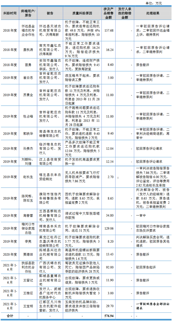 根据招股说明书,2018年至2021年6月末,沃得农机累计存在19起质量纠纷,涉及产品销售金额累计为576.94万元,质量纠纷原因为机子故障等。