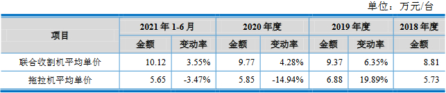2018年、2019年、2020年和2021年1-6月,沃得农机拖拉机平均单价分别为5.73万元/台、6.88万元/台、5.85万元/台和5.65万元/台。