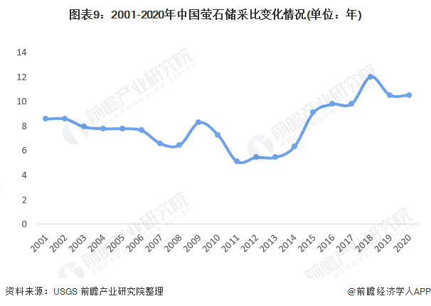 探明储量的上升并没有带来储采比增加。USGS数据显示,2001-2020年,中国萤石储采比呈现先下降后上升再下降的态势。2020年,中国萤石储采比为10.5,相较2019年持平,但是与其他年份相比,这一数值还是处于较高的水平上。综合来看,我国萤石资源开采过度,其储量占全球不到15%,而产量却接近60%。萤石储采比仅约为10余年,而全球采储比约45年,可见我国资源保障能力严重不足,资源安全堪忧。