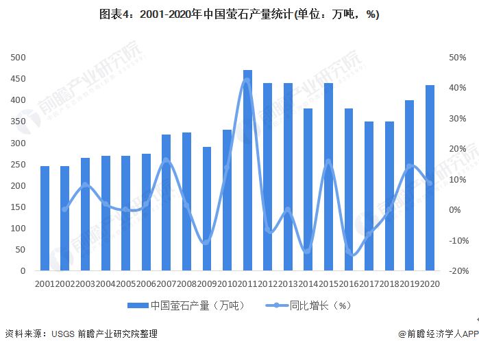 从产量上来看,2001-2011年,中国萤石产量呈现波动增加的态势;2011-2014年,由于萤石供给过剩,市场疲软,许多萤石开采计划被搁置,萤石价格一路下跌,萤石产量整体下滑。2017年以来,受益于整个大宗商品板块景气回升叠加需求端新兴氟化工带来的增量需求,萤石下游需求旺盛,供需错配导致萤石价格开始暴涨。据美国地质勘探局统计,2020年中国萤石产量在435万吨左右。