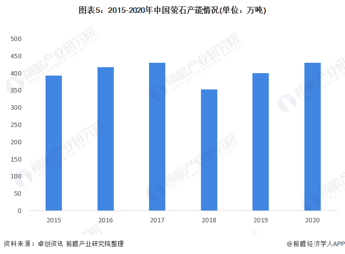 2015-2020年我国萤石产能较为波动。2019年我国萤石产能为400万吨,同比增长13%。中国是全球最大的萤石生产国,产能维持在350-450万吨之间,2020年中国萤石产能为430万吨,较2019年基本持平,占全球萤石总产量的56.6%。