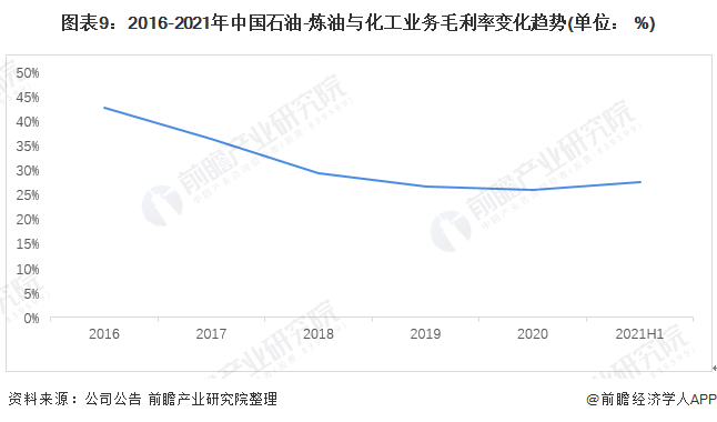 在毛利率方面,2016-2020年,中国石油炼油与化工业务毛利率呈下降趋势, 2020年仅为26.03%。2021年上半年毛利率有所回升,为27.50%。