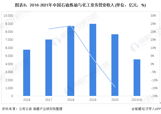 2016-2019年,中国石油的炼油与化工业务收入稳步增长。2020年受疫情影响,炼油与化工收入7663.58亿元,同比下跌14.39%。2021年上半年炼油与化工业务收入4561.29亿元。