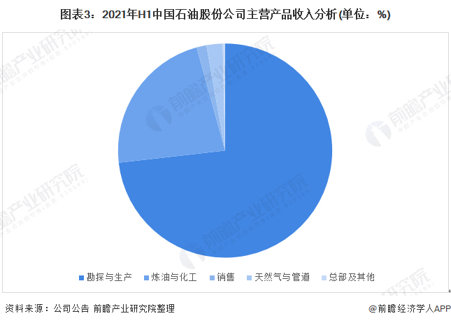 2021年上半年,中国石油主要业务包括石油勘探与生产、炼油与化工、销售、天然气与管道,其中石油勘探与生产是其主要收入来源。2021年上半年,石油勘探与生产营收占比为73.19%;其次是炼油与化工业务,占比约为22.52%。
