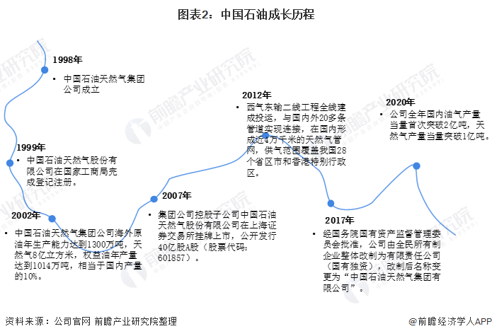 1978年第五届全国人民代表大会第一次会议研究决定设立石油工业部,即中国石油天然气集团的前身。1998年,中国石油天然气集团公司与中国石油化工集团公司共同成立,成立大会在人民大会堂举行。2002年,中国石油天然气集团公司海外原油年生产能力达到1300万吨,天然气8亿立方米,权益油年产量达到1014万吨,相当于国内产量的10%。2007年集团公司控股子公司中国石油天然气股份有限公司在上海证券交易所挂牌上市,公开发行40亿股A股(股票代码:601857)。随后集团参与西气东输工程等国家重大工程项目。2017年,公司由全民所有制企业整体改制为有限责任公司(国有独资),改制后名称变更为“中国石油天然气集团有限公司”。2020年全年国内油气产量当量首次突破2亿吨,天然气产量当量突破1亿吨。
