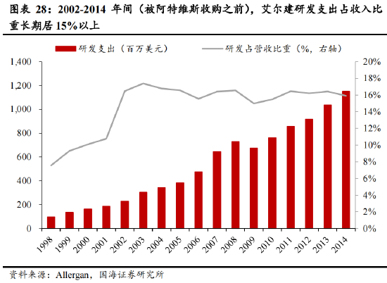 2002-2014年间(被阿特维斯收购之前),艾尔建研发费用率长期超过15%,高投入驱动下公司研发效率高居全球制药企业前五位,不输默克/诺华等研发巨头。